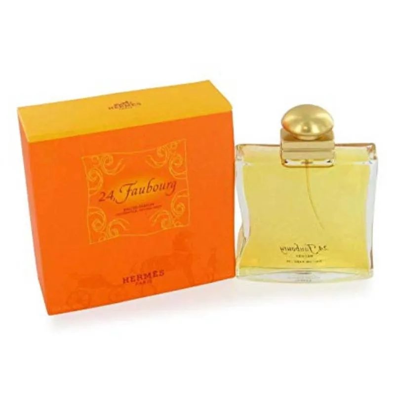FRAGRANCE DESCRIPTION: 24 Faubourg Perfume by Hermes, 24 Faubourg by Hermès is a sharp, light and bright floral perfume for women designed by Maurice Roucel. Released in 1995, this timeless fragrance invokes the breezy, sensual quality of exotic travel and sunny destinations. It opens with brilliant white floral top notes that seamlessly fuse with a mysterious heart of powdery iris and wood. Rich bottom notes of animalistic ambergris and sweet vanilla round out this distinctly feminine olfactory journey.