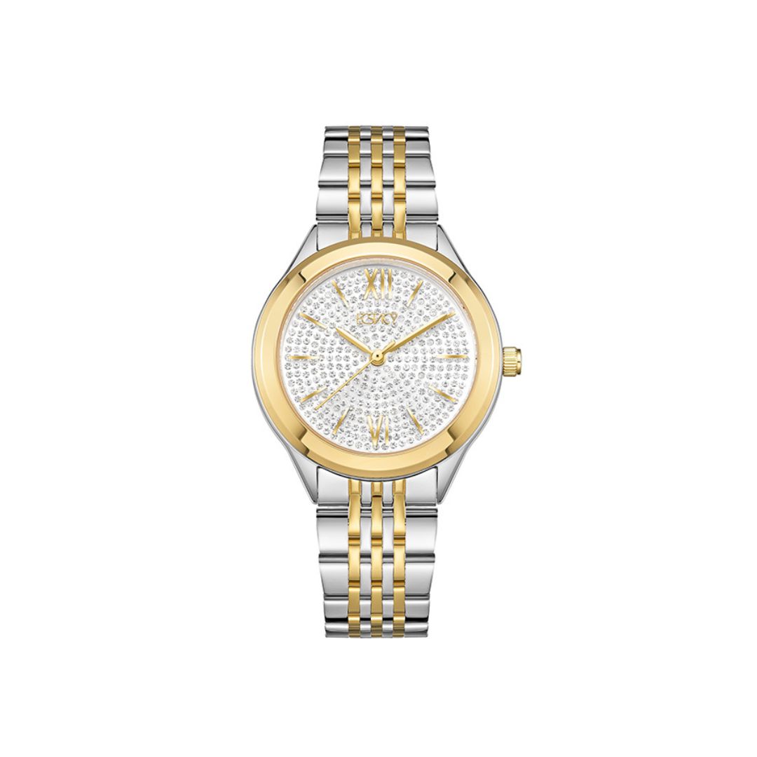 The Ecstacy E23517 TBTS is a stylish women’s analog watch featuring a silver dial and a rose gold strap.