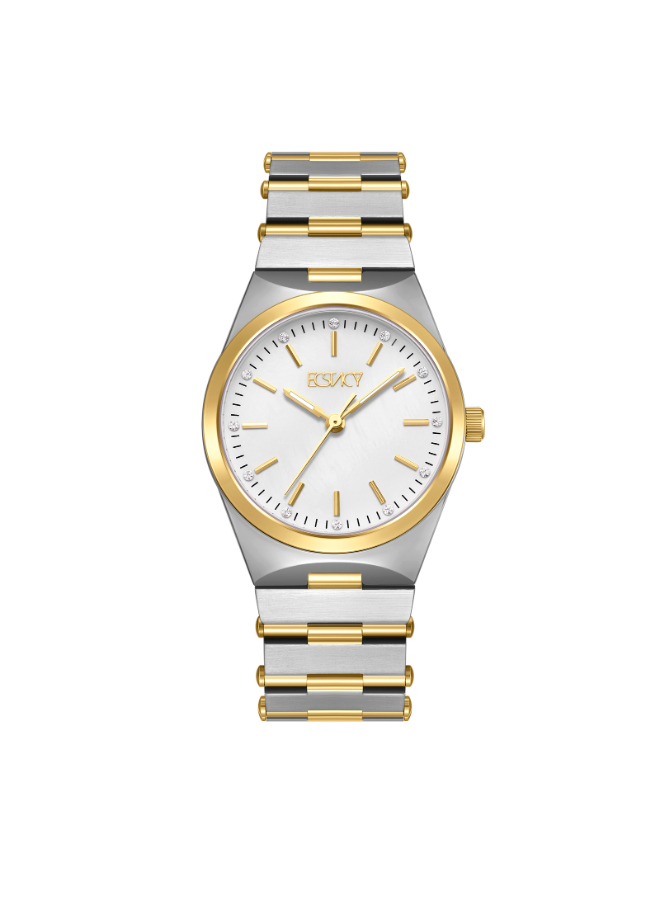 The Ecstacy E24501 TBTM is a graceful women’s analog watch featuring a white mother-of-pearl dial and silver bracelet.