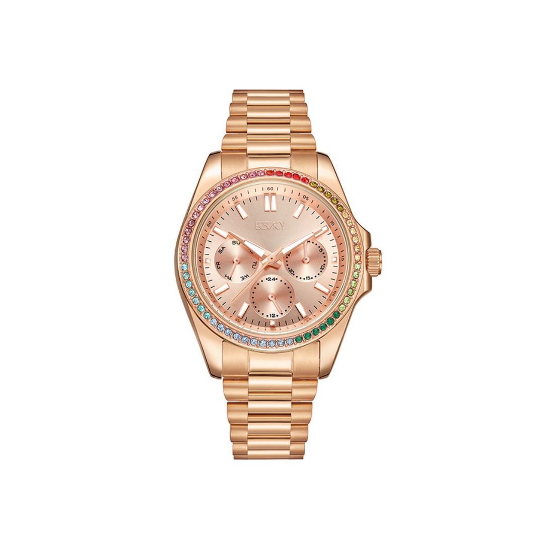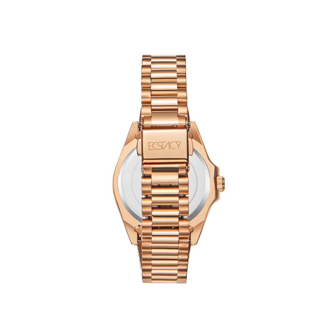 The Ecstacy E23615 RBKK combines elegance with practicality, boasting a rose gold dial with multifunction features like date, stopwatch, and alarm. Its coordinating rose gold bracelet adds a luxurious touch, making this analog-digital watch perfect for stylish women who need both fashion and function in one accessory.