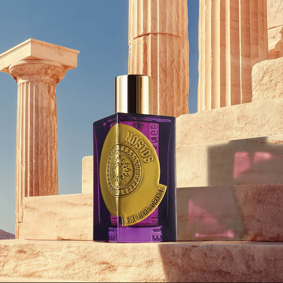 Nostos Eau de Parfum (EDP) by Etat Libre d'Orange opens with incense essence, mandarin essence, and saffron. The heart of the scent reveals Turkish rose essence, jasmine absolute, and an oud accord. The fragrance settles into sandalwood incense, Georgywood, Ambrofix, suede, and musk.