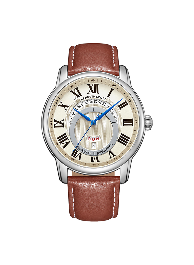 Kenneth Scott K24020 SLDI pairs timeless simplicity with contemporary appeal. The warm beige dial is set in a polished silver-tone case, offering clear readability with minimal design. Ideal for daily wear or casual outings, this analog watch blends understated style with reliable performance for the modern gentleman.