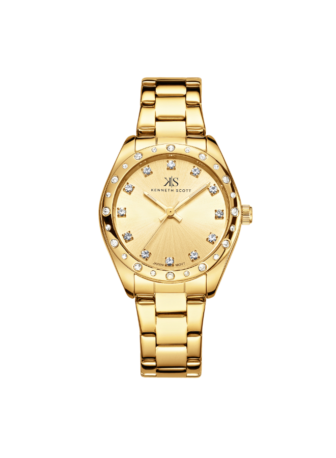 Kenneth Scott K24509 GBGC is a luxurious women’s analog watch featuring a gold dial and matching gold-tone strap.