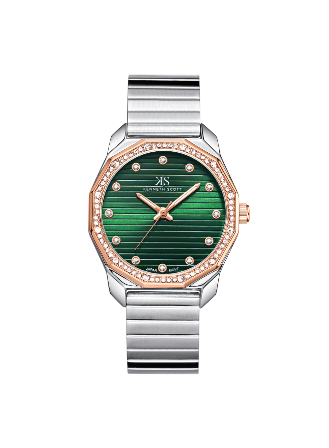 Kenneth Scott K24505 KBKH showcases a rich green dial with minimalist markers, perfect for adding a pop of color to any outfit. This women’s analog watch combines reliable quartz movement with a comfortable strap, making it ideal for both casual and formal occasions. A chic accessory for all styles.