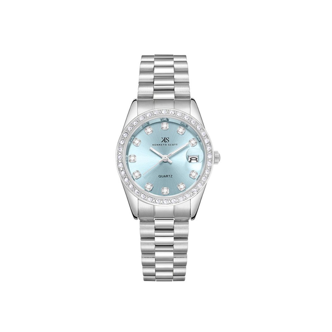 The Kenneth Scott K23545 SBSL combines a delicate light blue dial with a polished silver-tone strap for a fresh and elegant look. This analog watch offers reliable quartz movement and versatile style, making it perfect for women seeking a subtle yet sophisticated accessory for daily wear.