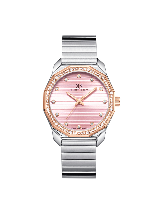 Kenneth Scott K24505 KBKP showcases a soft pink dial with minimalist markers, perfect for adding a subtle feminine touch to any outfit. This women’s analog watch combines reliable quartz movement with a comfortable strap, making it ideal for daily wear or special occasions. A charming accessory for all styles.