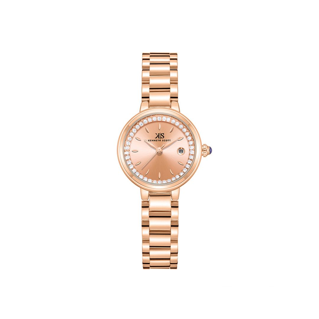 The Kenneth Scott K23542 RBKK combines a stunning rose gold dial with a coordinating rose gold strap, offering a sophisticated and stylish accessory for women. This analog watch delivers reliable quartz movement and timeless elegance, perfect for both everyday wear and special occasions.