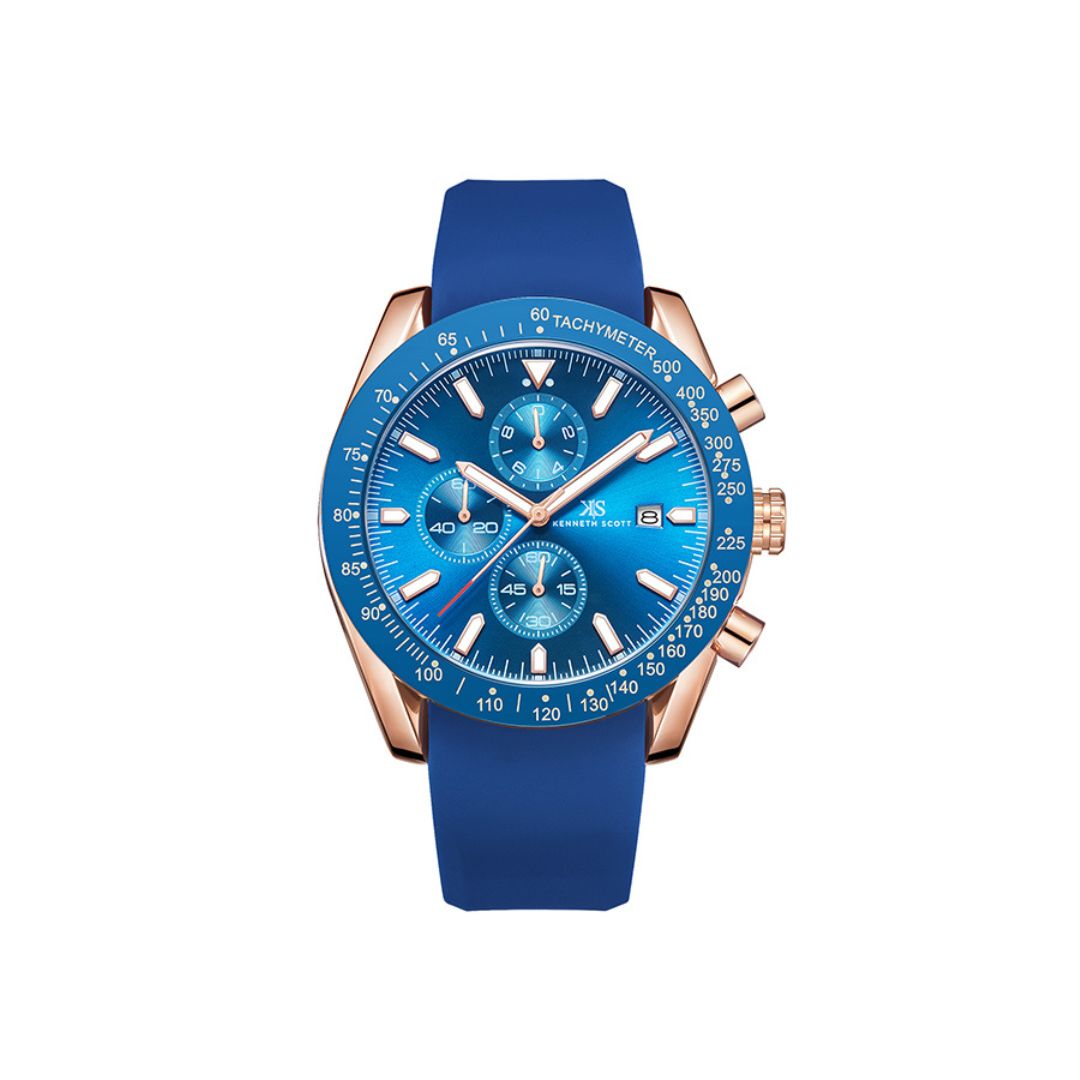Kenneth Scott K23148 RSNN combines a sophisticated dark blue dial with chronograph and multi-function features, including stopwatch and date subdials. This men's analog watch blends sporty utility with refined style, perfect for both casual and formal occasions. Durable and stylish, it complements any wardrobe effortlessly.