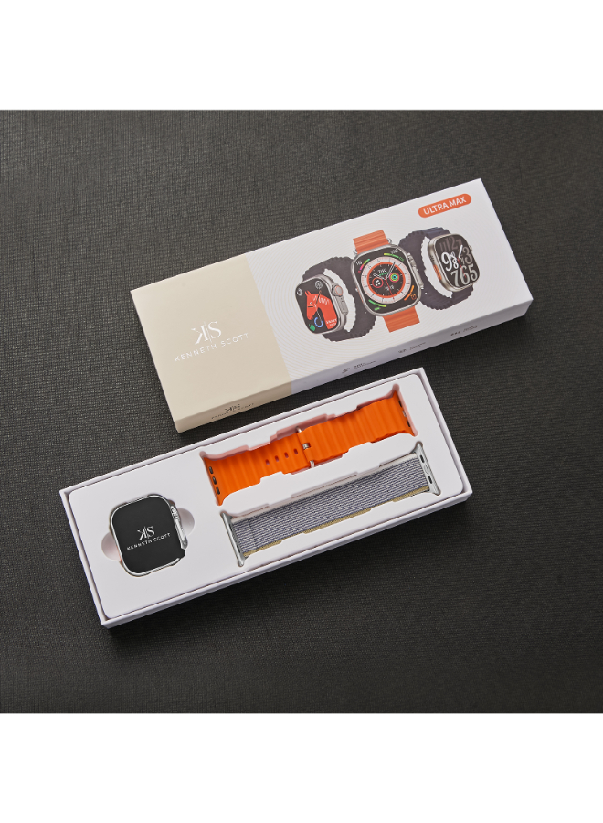 The Kenneth Scott KULMX SSOBX smart watch features a dynamic multi-color dial paired with a bold black-orange strap. Designed for unisex appeal, it offers smart features like call and message alerts, step tracking, and more—perfect for users seeking performance and flair in a single, fashionable wearable.