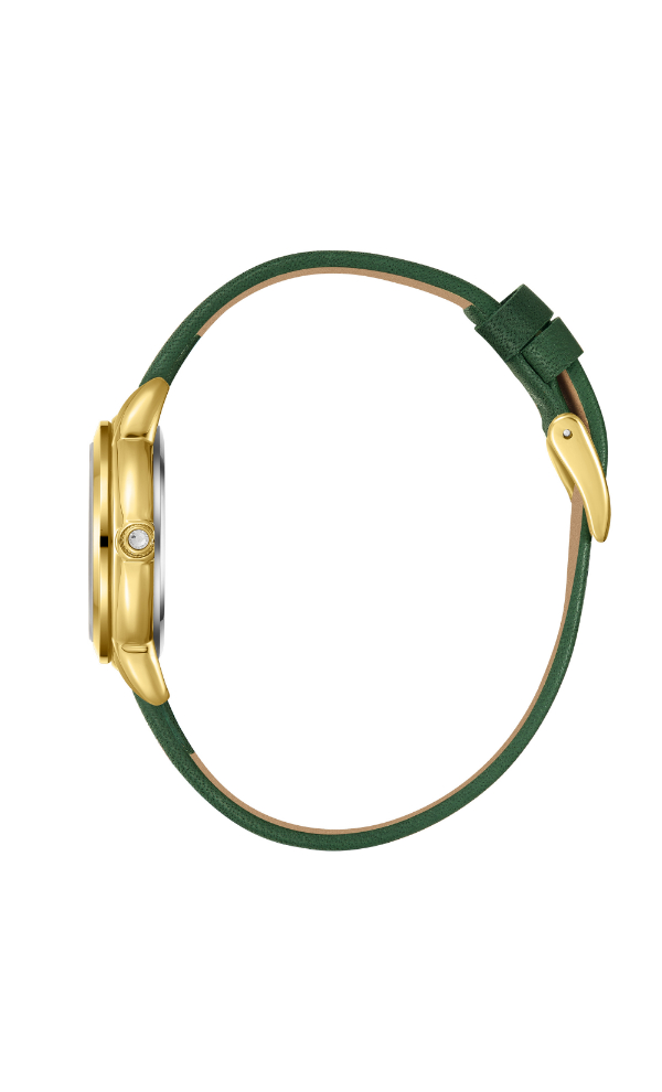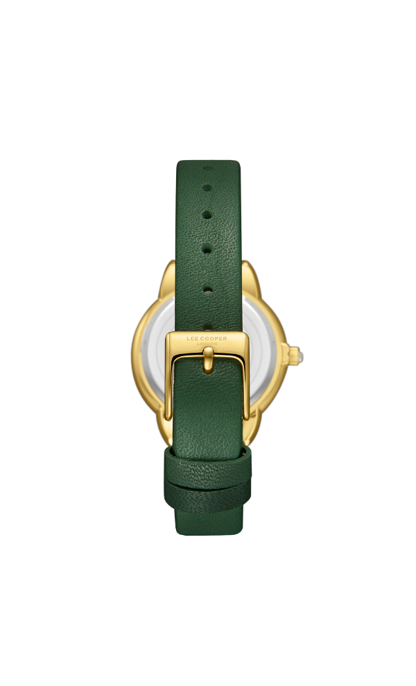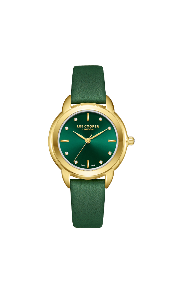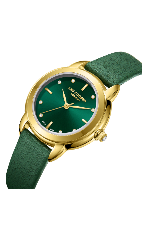 The Lee Cooper LC08025.175 is a women's analog watch with a stunning dark green dial and elegant rose gold accents.