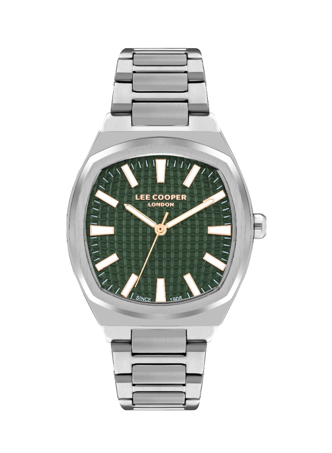 The Lee Cooper Analog Watch LC07984.370 features a refreshing green dial housed in a classic round case, offering a sophisticated twist to your daily style. Powered by reliable quartz movement, this timepiece blends functionality with bold color for the modern man who values both precision and distinctive design.