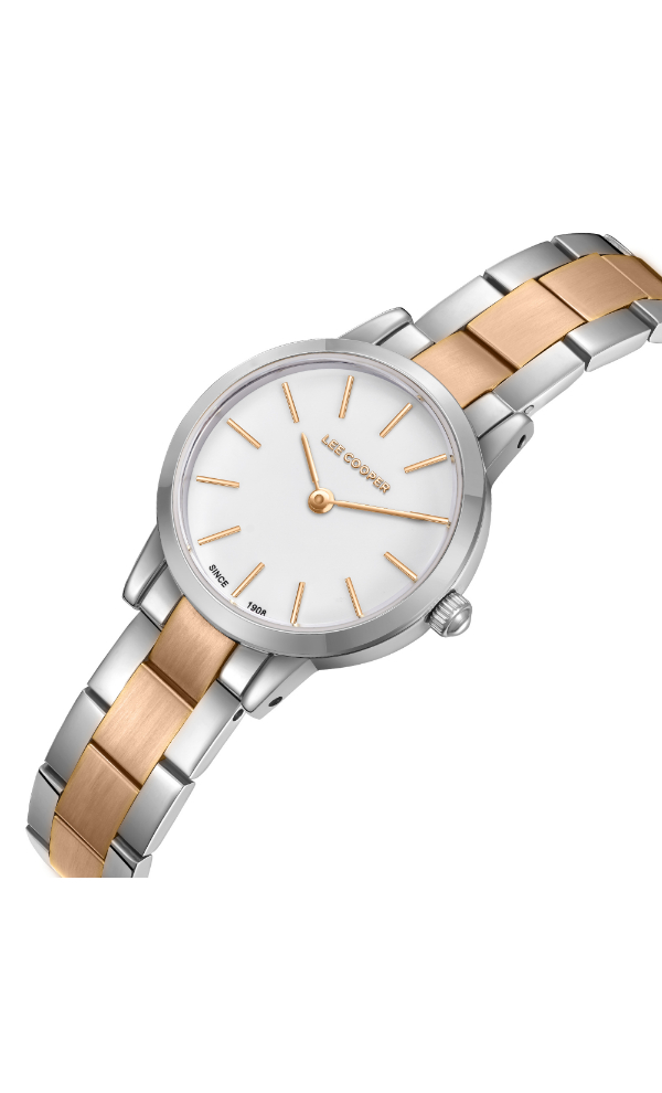 Lee Cooper Analog Watch LC08098.520 for Women radiates timeless grace with its shimmering mother of pearl dial and sleek indices. The polished finish and refined design create a sophisticated look, making it an ideal choice for formal occasions or elevating everyday wear with subtle elegance and a feminine glow.