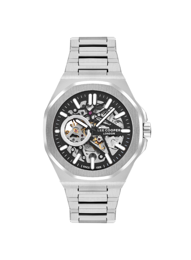 Lee Cooper Automatic Watch LC07977.350 for Men combines a sleek black dial with visible mechanical movement through an open-heart design. This self-winding watch is built for everyday use, offering a blend of functionality and modern style. A great choice for men interested in mechanical timepieces.