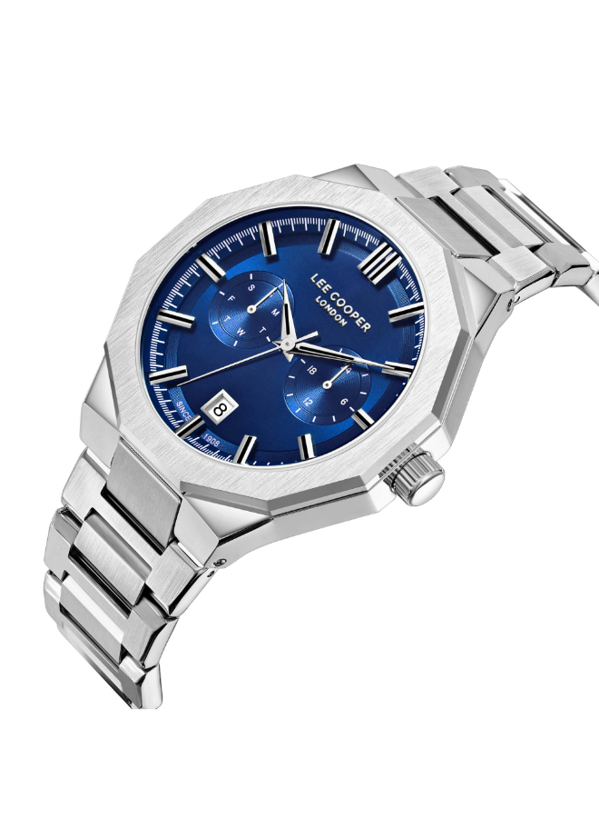The Lee Cooper LC08018.390 men’s multifunction watch features a vibrant blue dial with subdials for day, date, and 24-hour time.