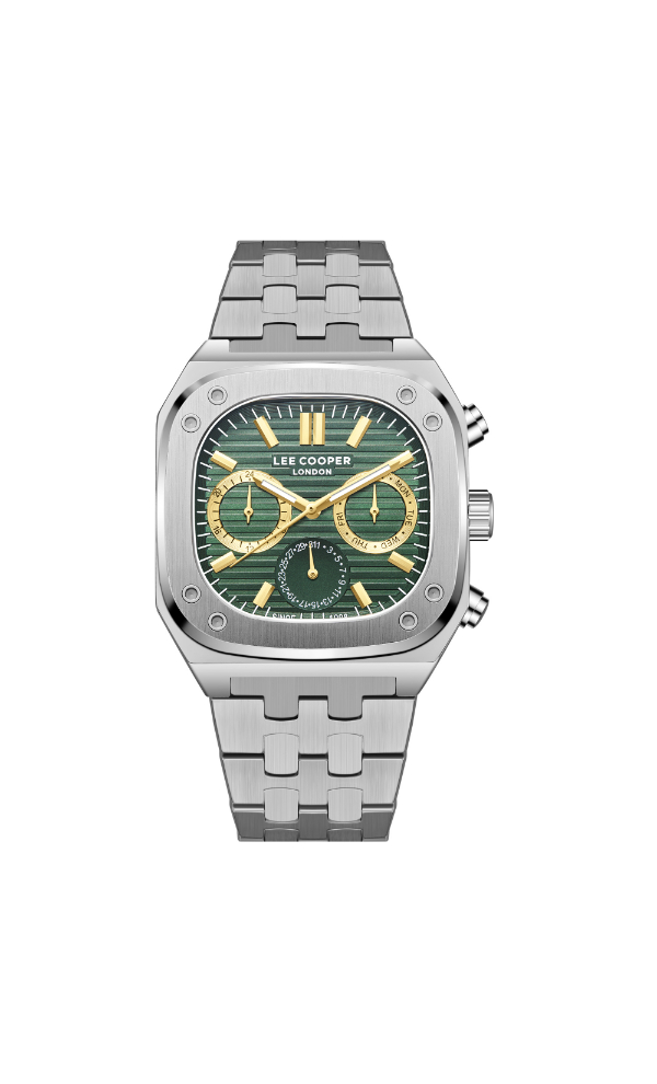 The Lee Cooper LC08023.370 Multi-Function Watch features a dark green dial with multiple sub-dials set in a robust case. Powered by quartz movement, it offers accurate timekeeping and useful features. Designed for daily wear, this watch works well with both casual outfits and semi-formal attire.