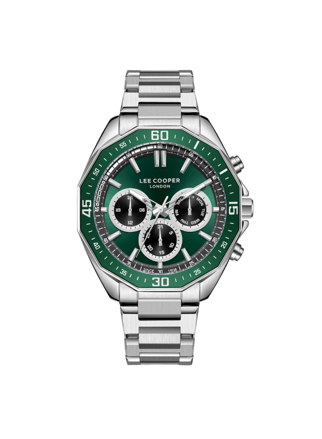 The Lee Cooper LC08021.370 multifunction men’s watch showcases a bold green dial with day, date, and 24-hour subdials.
