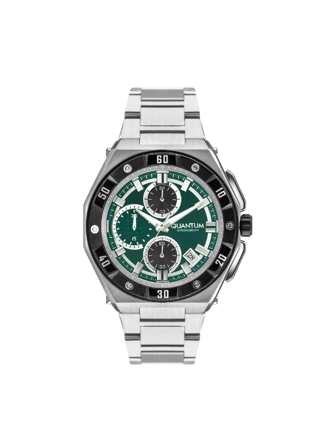 The Quantum HNG1011.370 is a men’s chronograph watch featuring a vibrant green dial and precise multifunction subdials.