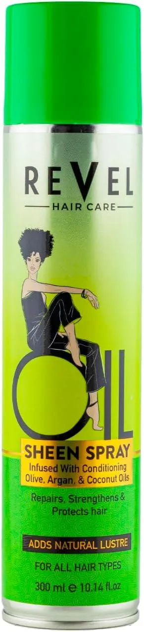 Introducing Revel Olive Argan & Coconut Oil Sheen Spray, the perfect addition to your hair care routine. Whether you have coils, curls, waves, or straight tresses, this sheen spray is designed to cater to your specific needs, keeping your hair looking soft, lustrous, and well-nourished. Our special formula is enriched with the goodness of olive oil, known for its moisturizing and nourishing properties. It helps to hydrate your hair, reduce frizz, and add a natural shine. Whether you're looking for a sleek and polished look or want to enhance your natural curls, this sheen spray is your go-to product. For those with straight hair, this sheen spray provides a lightweight, non-greasy formula that adds a healthy shine to your strands without weighing them down. It helps to tame flyways and provides a smooth, silky finish, leaving your hair looking effortlessly glamorous. For those with curly or textured hair, this sheen spray helps to enhance your natural curls, adding definition and bounce. It moisturizes your curls, reducing dryness and frizz, and gives them a healthy and radiant appearance. Say hello to beautifully defined and manageable curls. To use, simply shake the bottle well and hold it approximately 8-10 inches away from your hair. Spray evenly throughout your hair, focusing on the mid-lengths to ends. You can use it on dry or damp hair, depending on your preference and styling needs. Style as desired and enjoy the lustrous results. The 300ml bottle provides ample product for multiple uses, making it a long-lasting addition to your hair care routine. Experience the benefits of Revel Olive Oil Sheen Spray and elevate your hair game to new heights.