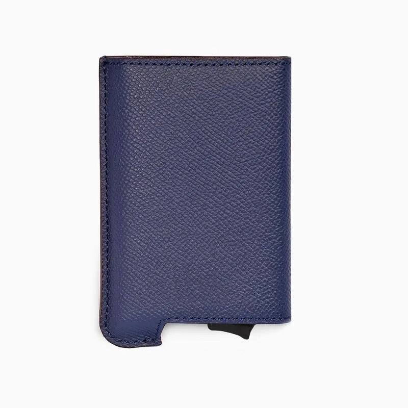 Thin stylish yet practical Santino Popup leather card holder for 6-7 cards which are protected against skimming by Anti-RFID technology. The upper case made from high-quality soft grained Italian leather and has an integrated Pop up design Aluminium hard case inside. Due to the sliding system at the bottom, the cards come up stepwise in a smooth movement. This pocket unique cardholder is the smart solution to protect your cards in one safe place.