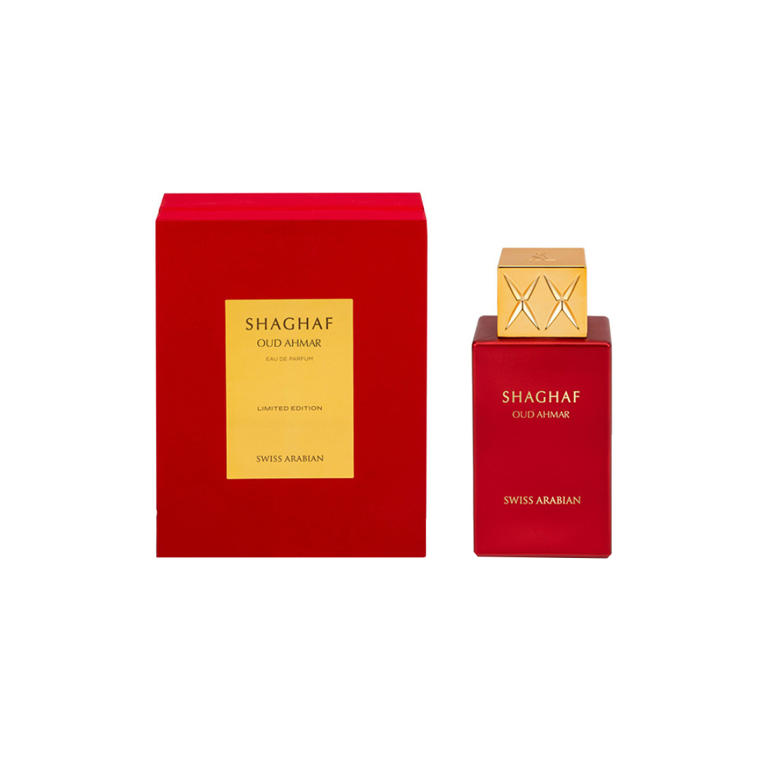 Shaghaf Oud Ahmar Eau de Parfum (EDP) by Swiss Arabian opens with peach, melon, bergamot, freesia, and iris. The heart of the scent reveals apple, amber, rose, and tonka bean. The fragrance settles into amber, vanilla, musk, sandalwood, cedar, and oud.