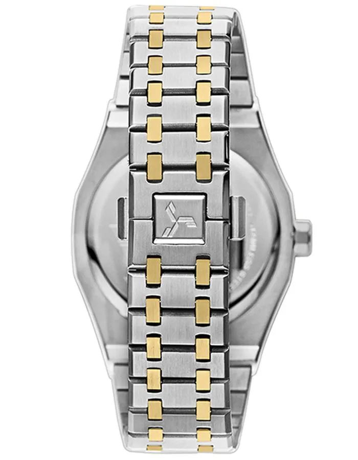 <p>Round Stainless Steel Silver case with Multi-Function display, Black dial<br /> 42mm case diameter, Japan Quartz movement, 5 ATM water-resistant<br /> Gold Stainless Steel bracelet with Push Button Clasp</p>